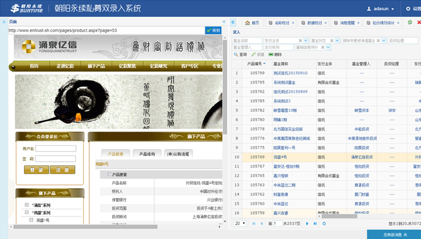 朝陽永續(xù)私募雙錄入項(xiàng)目是重構(gòu)項(xiàng)目,主要用來實(shí)現(xiàn)基于金融報(bào)告等的數(shù)據(jù)的錄入、校對(duì)。系統(tǒng)實(shí)現(xiàn)了管理員對(duì)錄入和校對(duì)人員進(jìn)行授權(quán)并對(duì)錄入人員進(jìn)行分組,錄入人員1和錄入人員2使用平臺(tái)錄入數(shù)據(jù),校對(duì)人員進(jìn)行校對(duì)、扣分、一致提交入庫等操作。系統(tǒng)通過雙錄入和校對(duì)機(jī)制從而減少了數(shù)據(jù)錄入的錯(cuò)誤率,提高了數(shù)據(jù)準(zhǔn)確性。