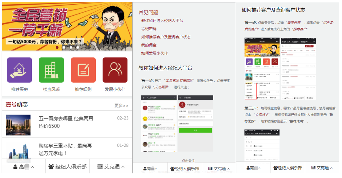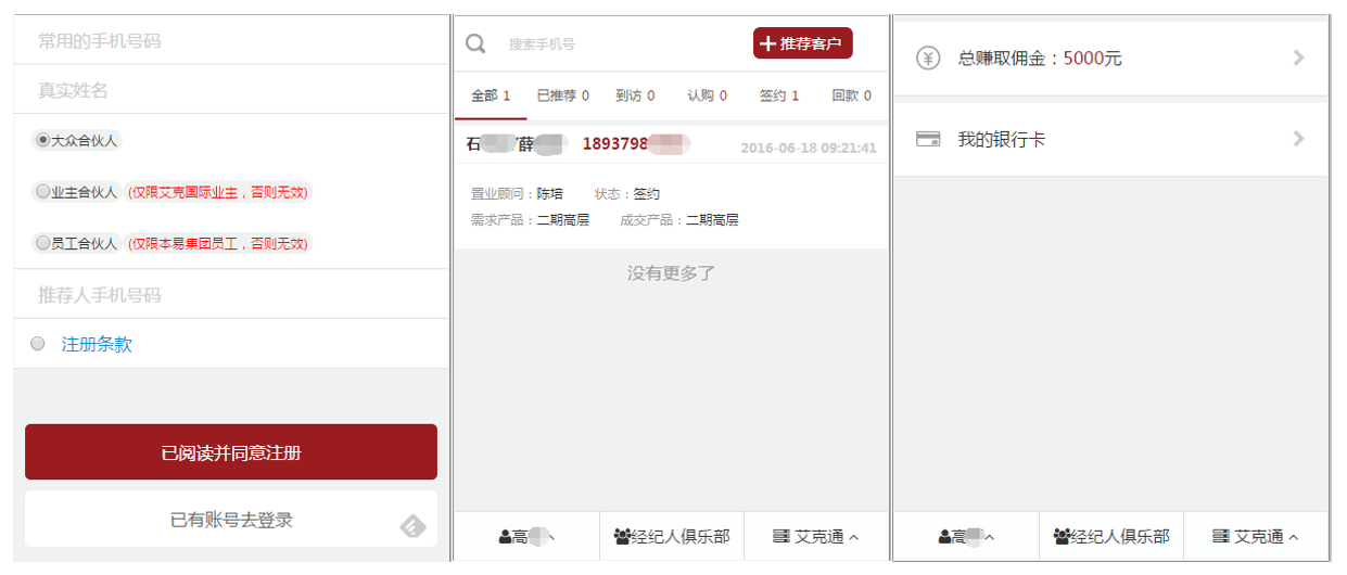 客戶注冊:擁有微信并關注公眾號,即可注冊申請成為全民營銷系統(tǒng)的用戶(全民經紀人)。注冊用戶可隨時通過微信查看已經推薦的客戶信息、購房進度、傭金結算情況。