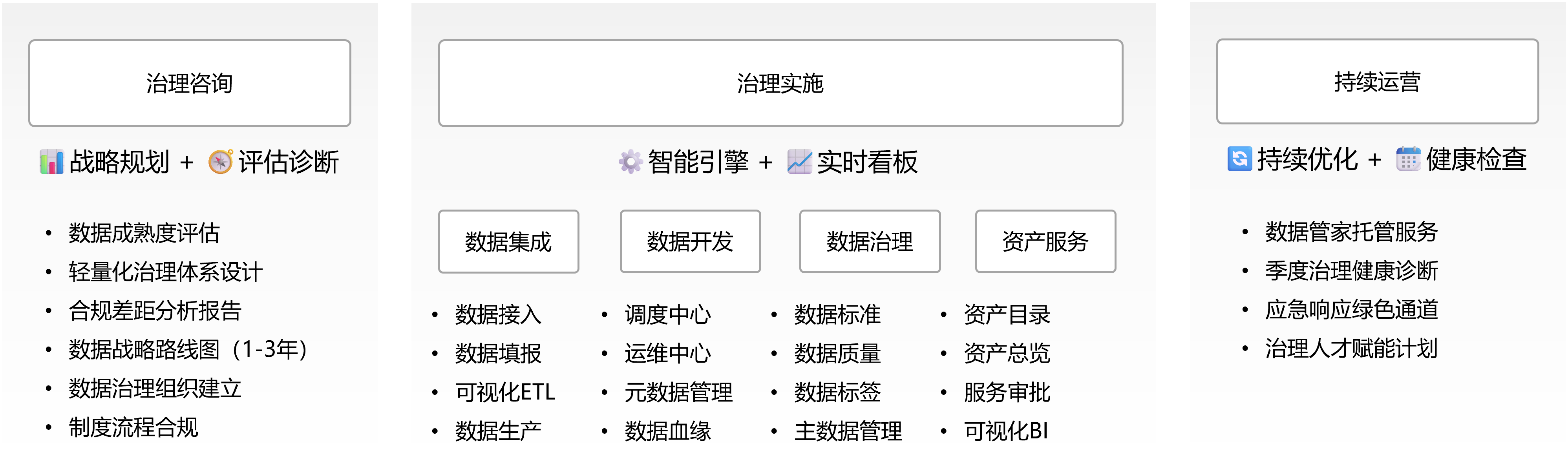 數(shù)據(jù)治理服務(wù)流程圖“樞理”從戰(zhàn)略高度出發(fā),開(kāi)展數(shù)據(jù)治理咨詢(xún)。通過(guò)數(shù)據(jù)成熟度評(píng)估,精準(zhǔn)診斷企業(yè)數(shù)據(jù)管理現(xiàn)狀;設(shè)計(jì)輕量化治理體系,適配企業(yè)規(guī)模與業(yè)務(wù)特性;出具合規(guī)差距分析報(bào)告,保障數(shù)據(jù)管理符合行業(yè)規(guī)范。同時(shí),繪制1 - 3年數(shù)據(jù)戰(zhàn)略路線(xiàn)圖,明確長(zhǎng)期治理方向;協(xié)助建立數(shù)據(jù)治理組織,厘清職責(zé)分工;規(guī)范制度流程,讓數(shù)據(jù)治理“有章可循”,為后續(xù)治理筑牢頂層設(shè)計(jì)基礎(chǔ) 。