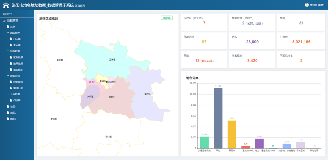 - 地名管理:地名規(guī)劃、更新維護(hù)、衍生業(yè)務(wù)、地名標(biāo)志、界線界碑、不規(guī)范地名排查等